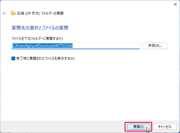 [圧縮(ZIP 形式)フォルダーの展開]画面が表示されるので、[展開]ボタンをクリックします。
