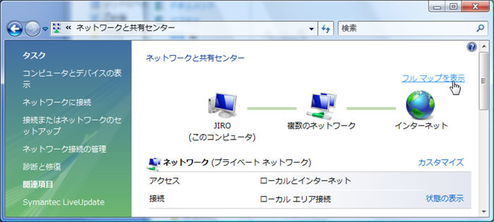 また、[フルマップを表示]をクリックすると、ネットワーク内のコンピュータが表示されます。アイコンの上にマウスポインタを移動するとIPアドレスやMACアドレスが表示されます。ゲートウェイなどのIPアドレスを特定するのに便利でしょう。