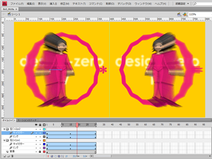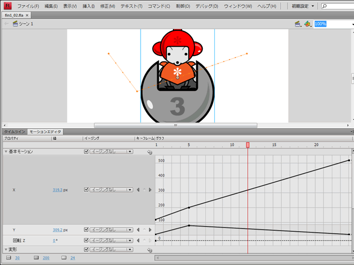 まず、基本的なモーショントゥイーンが、CS3までとは異なる新しいものとなり、オブジェクトベースでのアニメーション編集が前提となりました(CS3までのモーショントゥイーンは「クラシックトゥイーン」と呼ばれ、応用機能のような扱いになっています)。