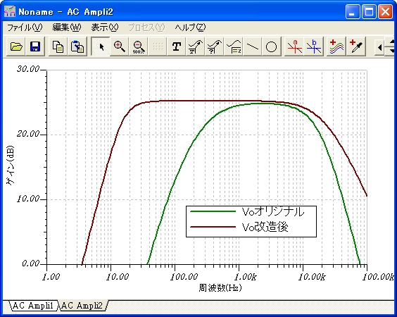 電子回路シミュレータTINAを使えば、このような広い範囲の測定が正確にできますし、実際の回路では測定が困難な位相の測定もできます。