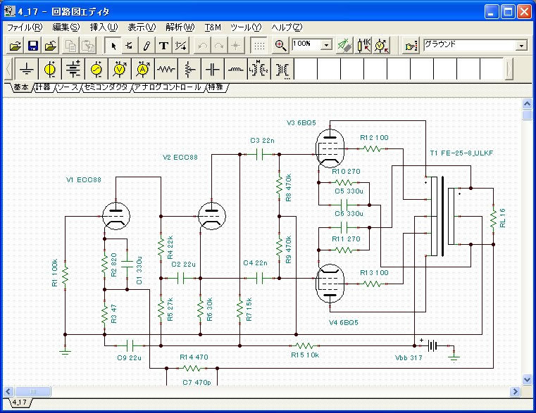 五極管やビーム管を生かして使うには、負帰還、ウルトラリニア接続、カソード帰還などのテクニックを使いこなせなければなりません。これらの動作を理解するには、オシロスコープなどを使って各部の波形を観測するのが一番ですが、電子回路シミュレータTINAを使えば、オシロスコープでは観測困難な箇所まで、正確に、じっくりと観測でき、これらの回路の働きを容易に理解することができます。