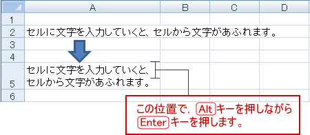 セルに文字を入力していくと、セルから文字が溢れてしまって、文字が表示されなくなってしまうことがあります。そんなときにはセル内で改行してしまうとよいでしょう。セル内で改行するには、セルを選択した状態で、[Alt]キーを押しながら[Enter]キーを押します。