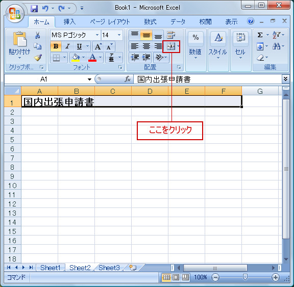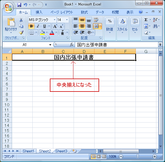 タイトルなど書類の中央揃えに配置したい文字列は、セルを結合してから中央揃えにします。セルを結合するには、隣接するセルを選択し、<セルを結合して中央揃え>ボタンをクリックすると文字列が中央揃えになります。