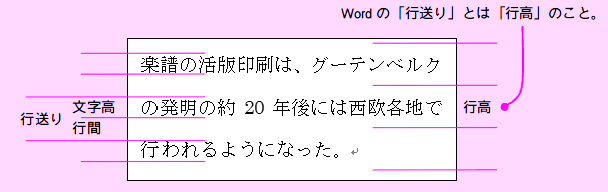実はWordには「行間」という考え方はなく、文字の上下の空きを含めた全体を「1行分のスペース」として扱うことになっています。Wordにある[行送り][行間][間隔]という項目名はすべて「行高」を示しています。