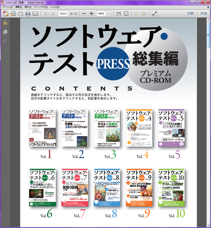 『ソフトウェア・テストPRESS総集編』には、既刊のVol.1~10のすべての記事をPDF化して収録しています。iPadやiPhoneなどで読みやすいよう、1冊を1ファイルとして作成してありますので、移動中や出先でも気軽に読めます。また、パソコンからであれば全文検索を用いながら、網羅的に読み進めることもできます。