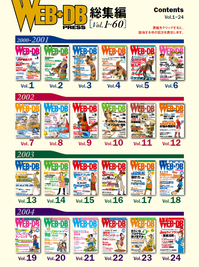 WEB+DB PRESSの創刊は2000年12月、現在は休刊中のJAVA PRESSという姉妹誌から派生する形で生まれました。当時はサーブレット/JSPなどのサーバサイドJavaが全盛で、Strutsが大流行する直前でした。「 Webサービス」という言葉が今とは違う意味(SOAPや「WS-*(ダブリュエススター) 」と呼ばれる周辺仕様群の総称)で使われており、ブラウザはほぼInternet Explorer一色で、FirefoxもChromeもまだ存在していませんでした。
