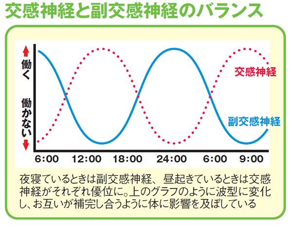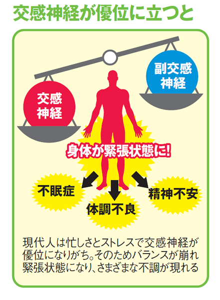 現代社会は自律神経が乱れる原因が沢山あふれています。1つは生活のリズムが乱れがちなこと。夜遅くまで仕事や飲み会などで睡眠不足になったりしていませんか? 人間が進化の過程で培ってきたリズムは自律神経の中に刻みこまれています。すなわち朝から昼にかけては交感神経が優位に立って活発に活動ができるようになる。夕方から夜にかけて副交感神経が次第に優位になり、