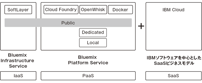 一言でクラウドといっても.クラウド事業者が提供する機能によってさまざまです。AWSはIaaS(Infrastructure as a Service)です。顧客が使いたいOSとアプリケーションをそのままネット上に構築するものです。それに対してPaaS(Platform as a Service )はOSの部分までをクラウド事業者にまかせて.顧客はアプリケーションの開発に注力するというものです。さらにSaaS(Software as a Service)がありますが.これはサービスの提供を主とするもので、Salesforce社が有名です。今回紹介するBluemixはPaaSに分類されます(SoftLayerというIaaSサービスもありますが割愛します)。IaaSは.自分でシステムを上から下まで全部やりたい人に向いています。しかし自分で管理するところがとても多く運用が大変です。一方.PaaSやSaaSは運用の手間をクラウド企業に任せてビジネスに注力したい人に向いています。