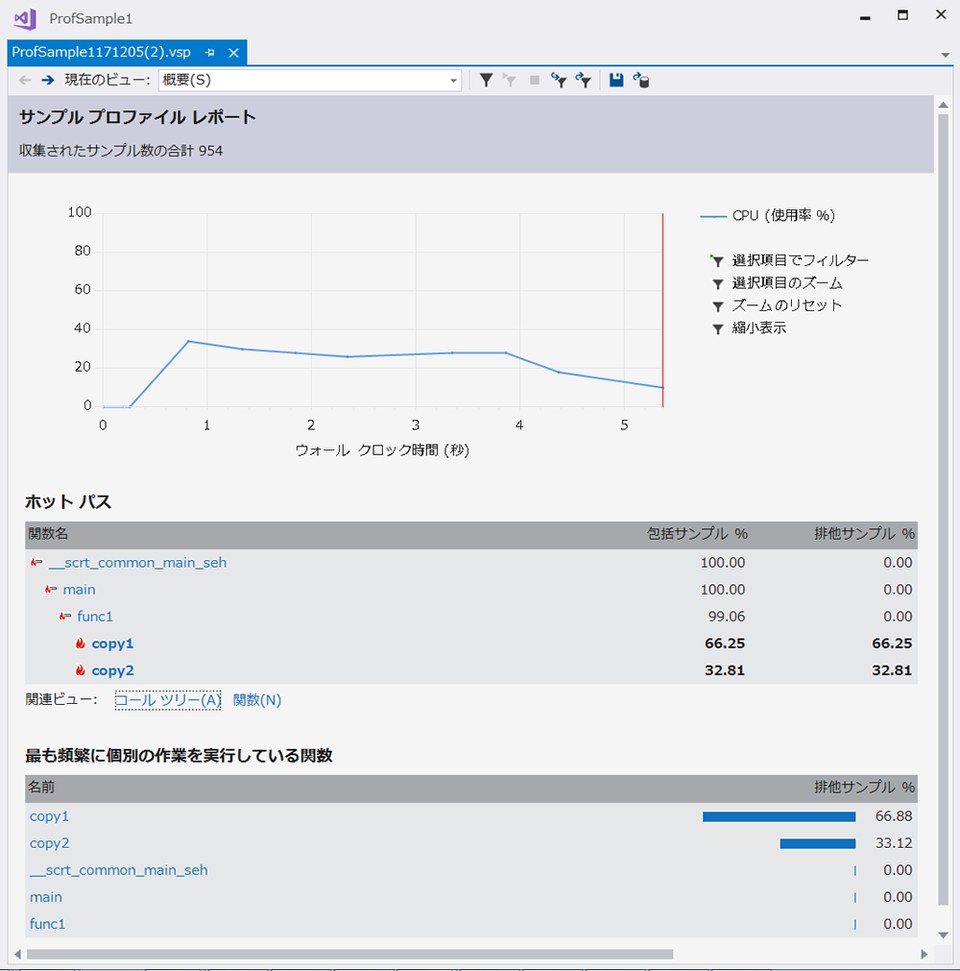 それではプログラムの実行を通して関数が何回呼び出されているかはどのように調べればいいでしょうか。Visual Studio Communityのプロファイラではインストルメンテーション方式を使うことで、呼び出し回数を調べられます。インストルメンテーション方式とは、プロファイラが関数呼び出し毎に記録する方式です。正確な呼び出し回数が分析できますが、オーバーヘッドがCPUサンプリングよりも大きく、もともと処理時間のかかるプログラムの解析にはさらに時間がかかる点は注意が必要です。