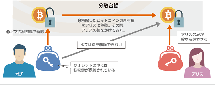 - ①分散台帳上で、ボブに所有権があるビットコインに錠がかけられている。所有権をアリスへ移す場合は、ボブの秘密鍵で解除する