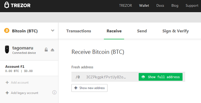 実際にそのようなマルウェアは観測されています。また、ハードウェアウォレットが生成して、画面に表示されるアドレスを攻撃者のアドレスに変更するようなマルウェアの場合も不正送金に繋がります。例えば、仮想通貨取引所に保管している仮想通貨を、自身のTrezor上のアドレス(図3)をコピーして、取引所のサイトにペーストして送金した場合、攻撃者に送金してしまうことになります。