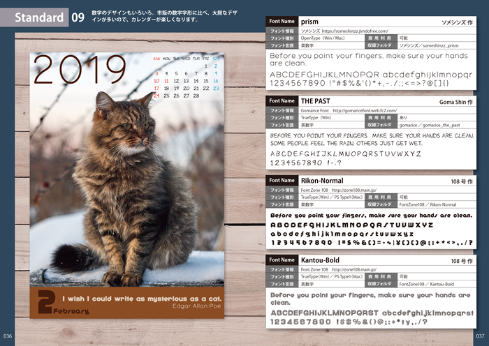 「スタンダード」ジャンルでのフリーフォント掲載。デザインサンプルは猫のカレンダーです