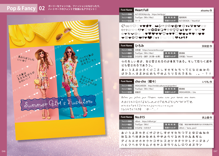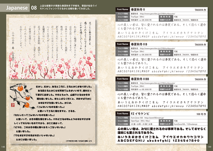 本書『デザイン力を加速する! フリーフォントCOLLECTIN』は、そんなフリーフォントを約300書体収録しています(付属CD-ROM)。「スタンダード」「ポップ&ファンシー」「デジタル&ゲーム」「キッズ&ベビー」「ゴシック&ホラー」「ジャパニーズ」「レトロモダン」と見た目のジャンルで分けて掲載し、実際に使用したらどんな感じになるのかがわかるように、デザインサンプルも掲載しています。商用利用が可能なフリーフォントも多数収録していますので、アマチュアや同人誌のデザイン、商用のデザインなど、使えるシーンは多いでしょう。