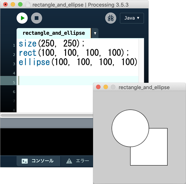 そんな方にお薦めなのが「Processing(図2)」です。Processingは、JavaScript、Pythonといったプログラミング言語より簡単に学習を始められ、すぐに試すことができます。また、ほかの言語では書かなければいけない「おまじない」のようなコードを書かずに済むので、理解も容易です。ほかの言語では、たとえばJavaScriptを実行するには、HTMLというほかの言語を一緒に書かなければなりませんし、ほかの言語でも、実際の命令文以外に書かなければならない「おまじない」がいろいろとあるのです。