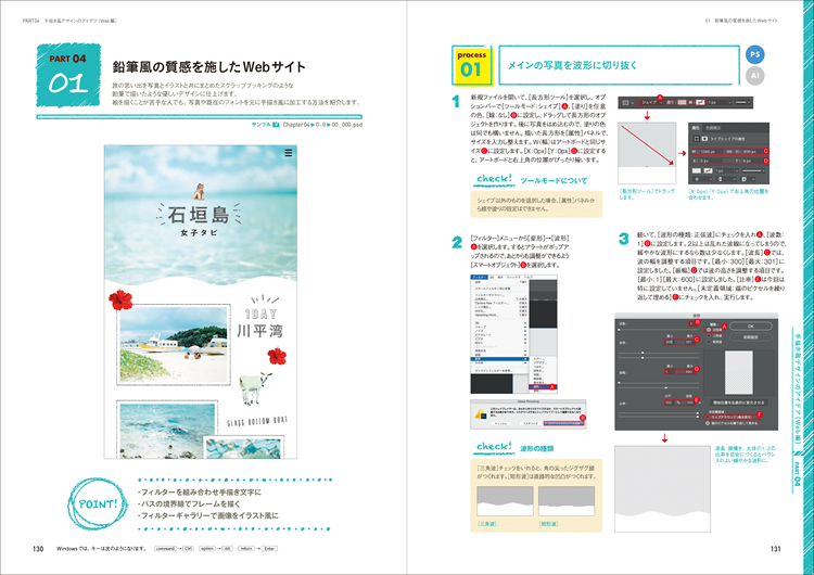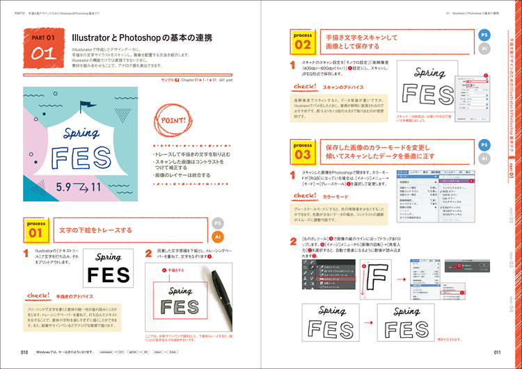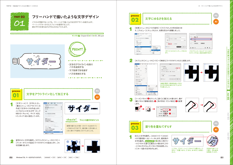 なお、本書で解説しているのは、手描き風、アナログ感あるデザインを作成するための「ポイント」です。そのポイントの手順やテクニックを解説していますが、ひとつの作品を作るための手順をすべて解説しているわけではありません。あくまでも、味わいのあるデザインを作るためのポイントを解説しています。