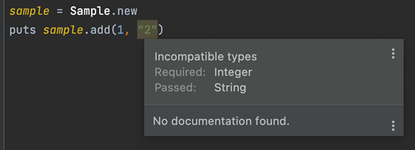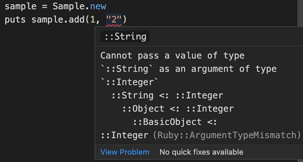 lib/sample.rb:7:19: [error] Cannot pass a value of type `::String` as an argument of type `::Integer`