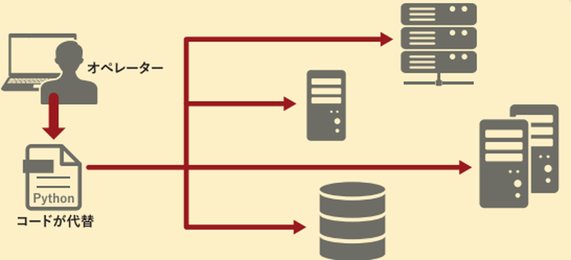 ITインフラエンジニアが手動で行っていた、1台1台の機器に対するインストールから環境設定といった作業を、プログラム(コード)に代替させることを自動化といいます。、サーバーやネットワークといったITインフラを自動化するのがインフラ自動化になります。オペレーターが手動で行っていた作業をコードやプログラムに代替することで、複数の機器を同時に、それも瞬時に設定できます(図1)。