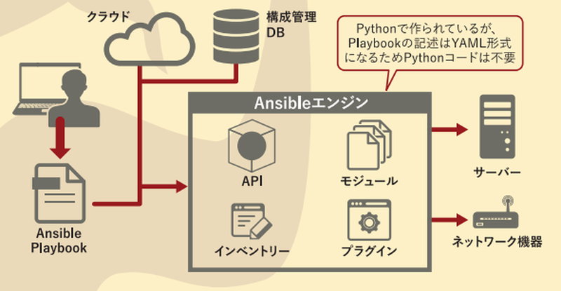 「Ansible」は、Pythonで作られたオーケストレーションツールです。ITインフラに対する設定や構成変更といった作業をコードによって自動的に実行します。米レッドハット社が開発しており、オープンソースソフトウェアとして提供されています。Pythonで作られていますが、モジュールを拡張するなどしない限り、Pythonコードを記述する必要はありません(図3)。