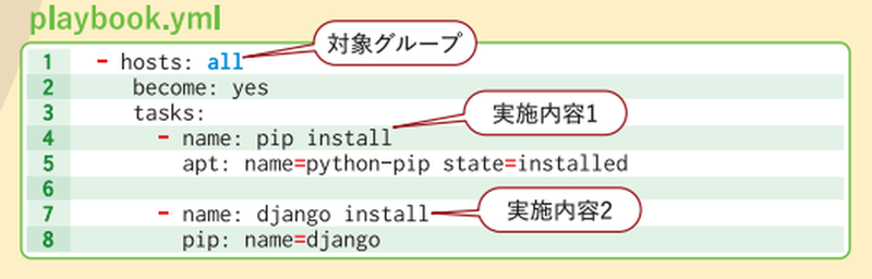 自動化コードは「Playbook」 といわれる定義ファイルにYAML(ヤムルと発音)形式で記述します(図4)。