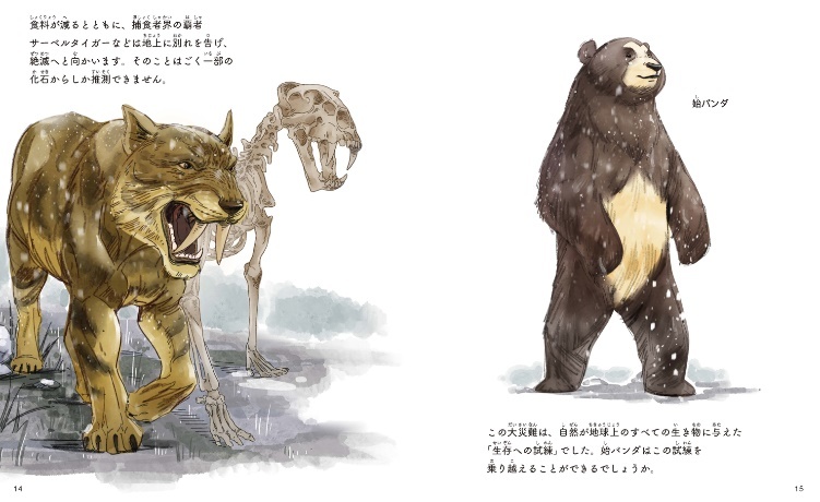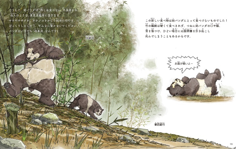 始パンダは、数々の苦難に遭います。やってきた厳しい冬を乗り越えなければならなくなり、それまでのように肉食主義では生き抜いていくことができなくなったのです。