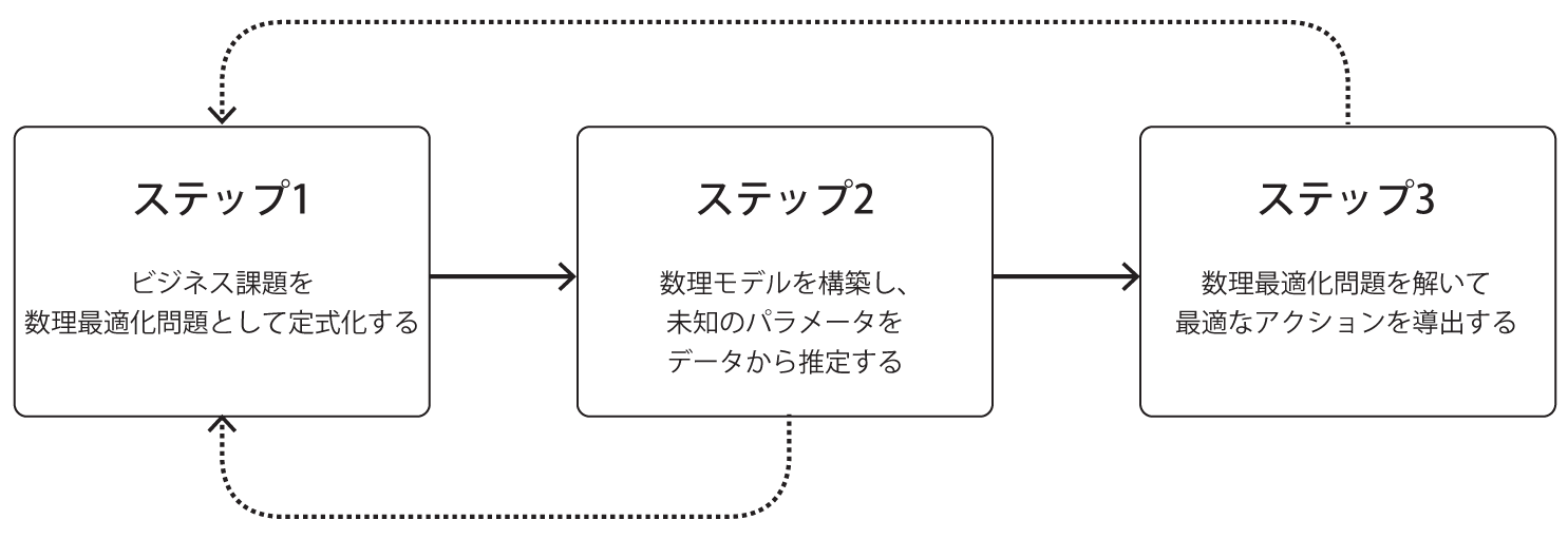 この3ステップは必ずしも順番通りに進むわけではなく、試行錯誤を繰り返して行ったり来たりする必要があります。ステップ2で適切なデータが入手できない場合や、ステップ3で数理最適化問題の解を見つけるのが困難な場合は、ステップ1に戻って問題の定式化を見直すことが有効です。