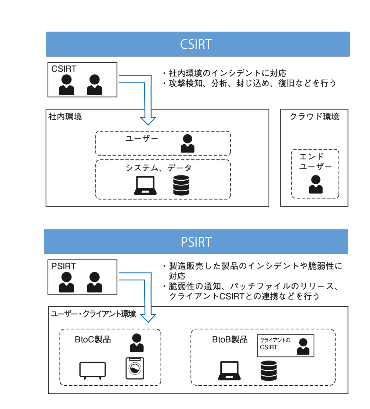 PSIRTと似た言葉で、CSIRT(Computer Security Incident Response Team)というものがあります。この2つは密接に関連していますが、対象範囲が異なります。