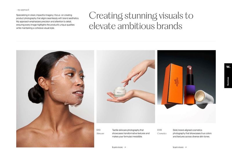 図53 カナダ・バンクーバーを拠点に、美容やスキンケア関連のコマーシャルフォトで活躍する写真家、Elina Kustlyvyのポートフォリオサイト。現在のウェブデザインでもよく見かける、洗練されたフラットデザインのウェブサイトのひとつ