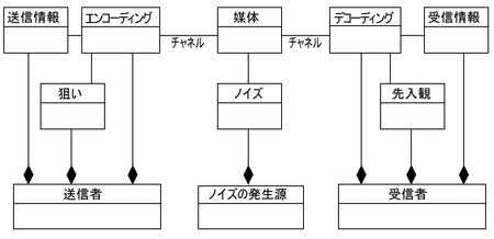 図1は、メッセージ送信者-受信者モデルを表しています。送信者は情報を媒体に合わせてエンコーディングし、受信者は媒体からデコーディングを経て情報を獲得します。そして、送信者はエンコーディングするときに、自分の思惑などにより情報を変形する可能性があり、受信者はデコーディングの際、先入観などから情報を変形して受け取る可能性があります。また、媒体にはノイズが入る可能性もあります。