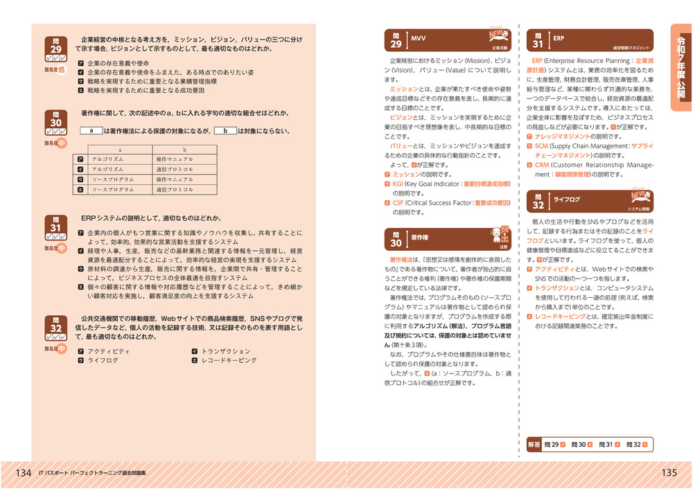 『令和08年【上期】ITパスポートパーフェクトラーニング過去問題集』をお買い上げいただいた読者の方への特典として,過去問題PDFと,要点整理bookがダウンロードできます。それぞれ,PDFリーダーソフトやEPUBリーダーソフトで閲覧できます。ダウンロードの際,書籍のP.414に掲載しているパスワードが必要になります。