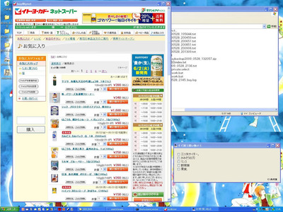 ネットスーパーのホームページと買い物メモのチェックリストのウィンドウを開きます。左のブラウザはネットスーパー用の専用オリジナルブラウザ。ログインを自動で行ってくれるほか、メニューなどは不要なので存在しません。チェックリストは買い物が終了すると、買ったものの一覧を自分宛にメールし、ログを自動的に保存して次回以降のデータとします。こちらもメニューは不要なので、メニューはありません。