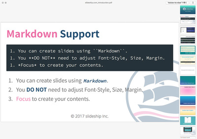 GitHubアカウントのOAuth認証に対応しており、ログインすると、ちょっとしたドキュメントを作成するような手軽さでスライド資料を作成することができる。作成したスライドは、プライベートまたは公開資料としてクラウド上に保存することができ、さらに、すでに作成したスライドを再利用することも容易にできるようになっている。企業概要や自己紹介ページなどのくり返し使用する素材の利用に便利。また、作成したスライドはPDF形式でダウンロードもできる。公開されたプレゼンテーション資料はアカウントがなくても閲覧可能。