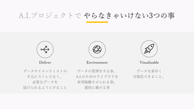 データを効率的に扱うには、インフラ面に加えて「ちゃんと見せてあげることも必要」だと話します。具体的には、「いま手元にあるデータは何件か、どんなデータが入っているのか、分布はどうかといったことが見えるだけで、データサイエンティストはやりやすくなります」と説明しました。