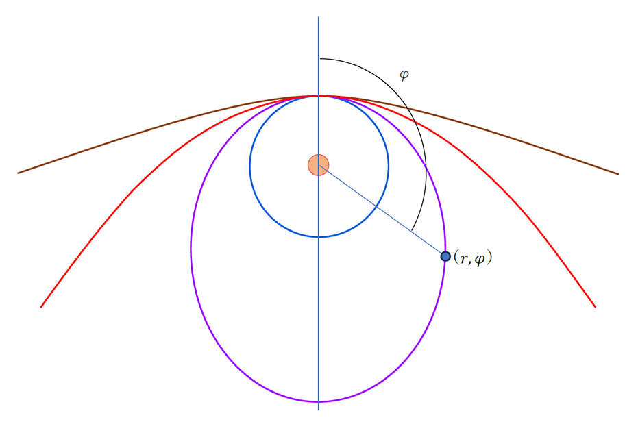 するとこれはニュートン力学での惑星の軌道式です。この式を描画すると、円、楕円、放物線、双曲線が現れます。ユークリッド幾何とニュートン力学の繋がりはここにあるのだといえそうです。
