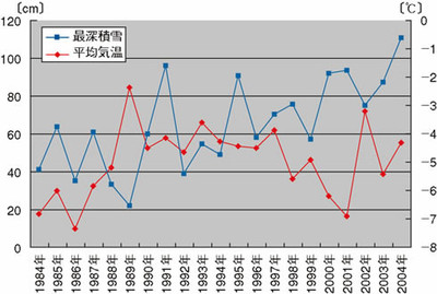 しかしながら、太平洋側では気温が低いことだけが雪が降る条件ではなく、低い気温の時に低気圧が通過して雪を降らせなければ、積雪は多くなりません。図2は北海道の太平洋岸の年である帯広市の最深積雪と平均気温のグラフです。これを見ると、気温が高くても最深積雪が大きい年もあり、特に気温と降雪の相関が高いわけではないことがわかります。